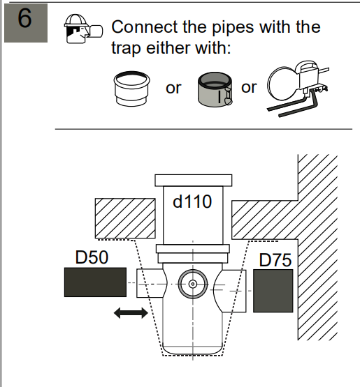 Characteristics: Straight connector permanently mounted, ø 75 mm, made of PE-HD. Three connection options, made of PE-HD, ø 50 mm. Trap insert can be removed without tools.